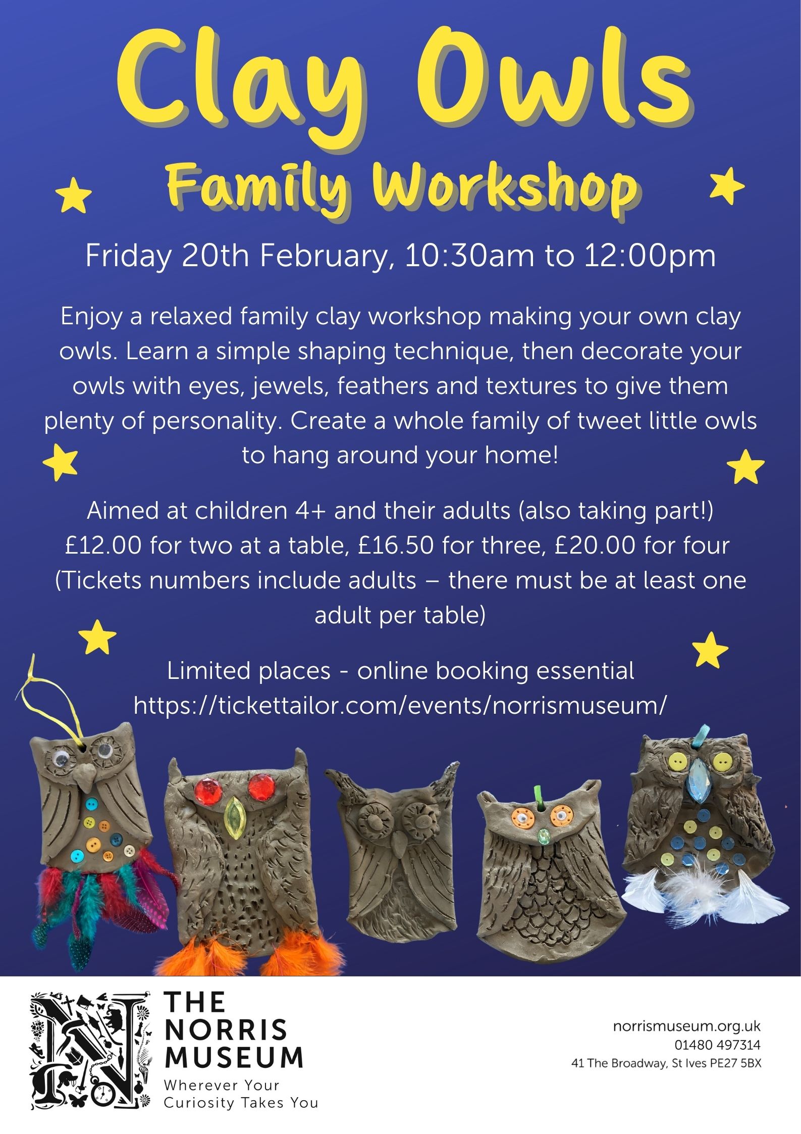 A relaxed family clay workshop where you’ll make your own clay owl hanging decorations. Learn simple techniques and decorate with textures, feathers and details to create a whole family of unique owls.