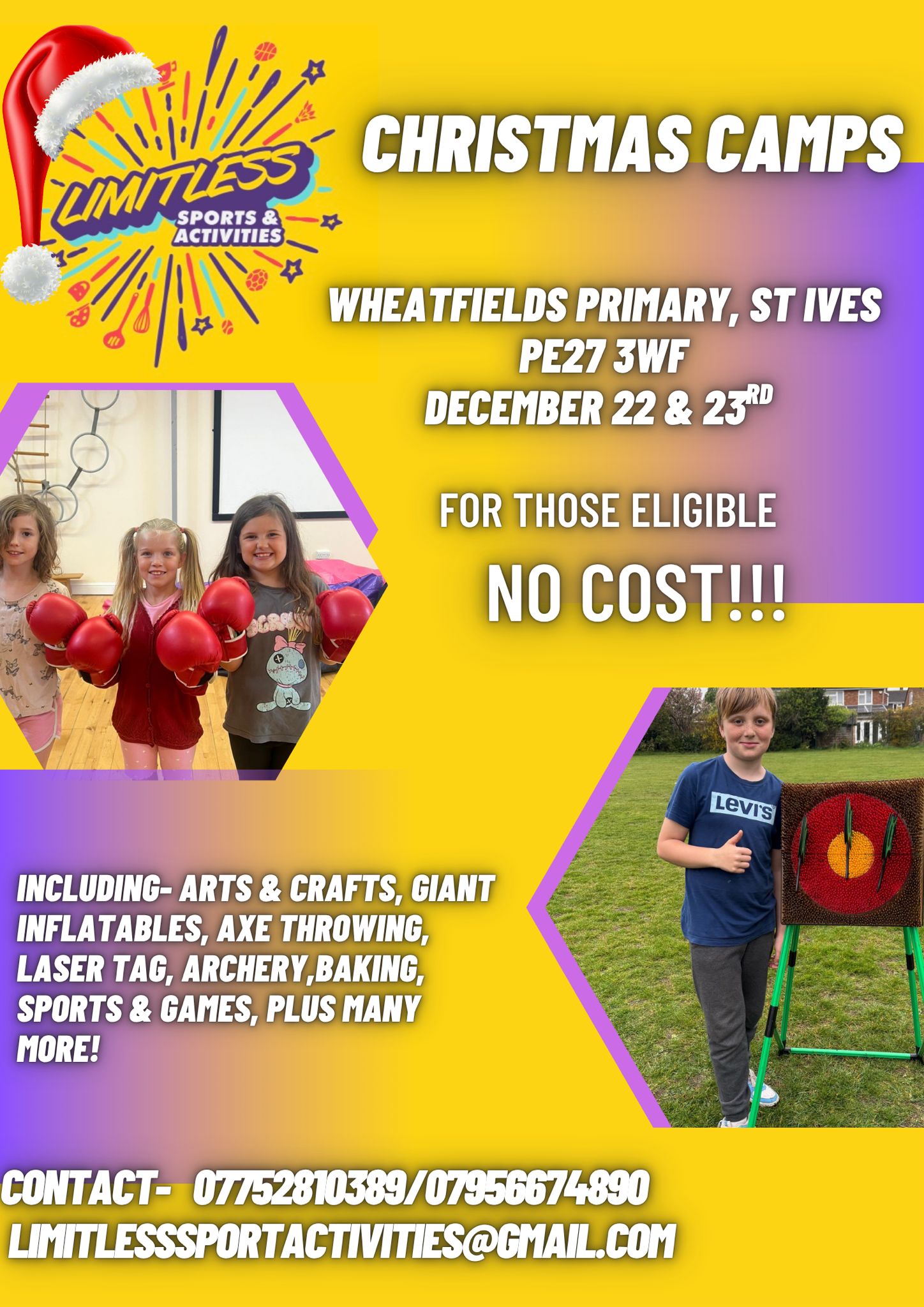 Limitless Activities are back at Wheatfields for Christmas on Monday 22 and Tuesday 23 December with NO COST places available for your children, where eligible (more information and poster to follow).